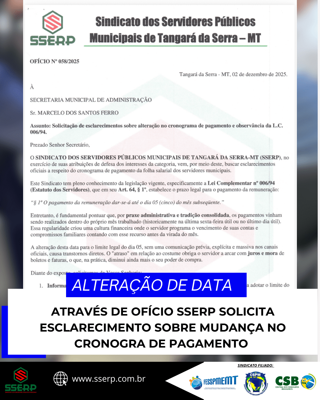 O Sindicato dos Servidores Públicos Municipais de Tangará da Serra (SSERP) enviou um ofício à Secretaria Municipal de Administração solicitando esclarecimentos sobre uma possível alteração no cronograma de pagamento da folha salarial dos servidores municipais. A principal dúvida dos servidores refere-se à mudança do pagamento, que historicamente ocorria na última sexta-feira útil do mês, para o quinto dia útil do mês subsequente, conforme estabelece a Lei Complementar nº 006/94.